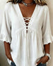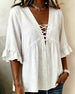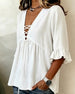 SPESIFIKASJONER Topp type: Bluser Stil: Uformelt Materiale: Bomullsblandinger Anledning: Daglig Halslinje: V-hals Mønstertype: Ensfarget Ermetype: Volanger erme Erme lengde: 3/4 erme Passform type: Vanlig Årstid: Vår,Sommer Detaljer: Rufsete,Kryssstropper Pakken inkluderer: 1 x Bluse STØRRELSESTABELL (cm) Størrelse Bryst Lengde S 110 73...