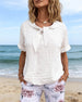 SPESIFIKASJONER Topp type: T skjorte Stil: Uformelt Materiale: Bomull og lin Anledning: Daglig Halslinje: Rund hals Mønstertype: Ensfarget Ermetype: Vanlig erme Erme lengde: Kort erme Passform type: Vanlig Årstid: Vår,Sommer Detaljer: Snøre opp Pakken inkluderer: 1 x T-skjorte STØRRELSESTABELL (cm) Størrelse Bryst Lengde S 97 65 M 101 66...