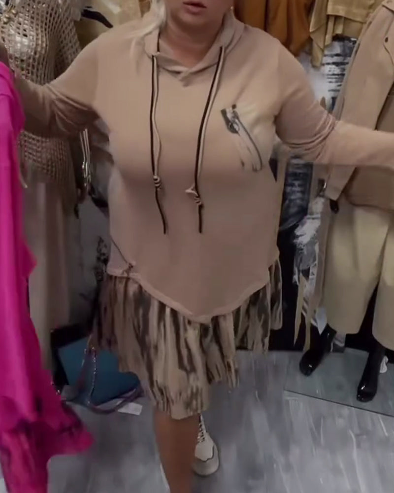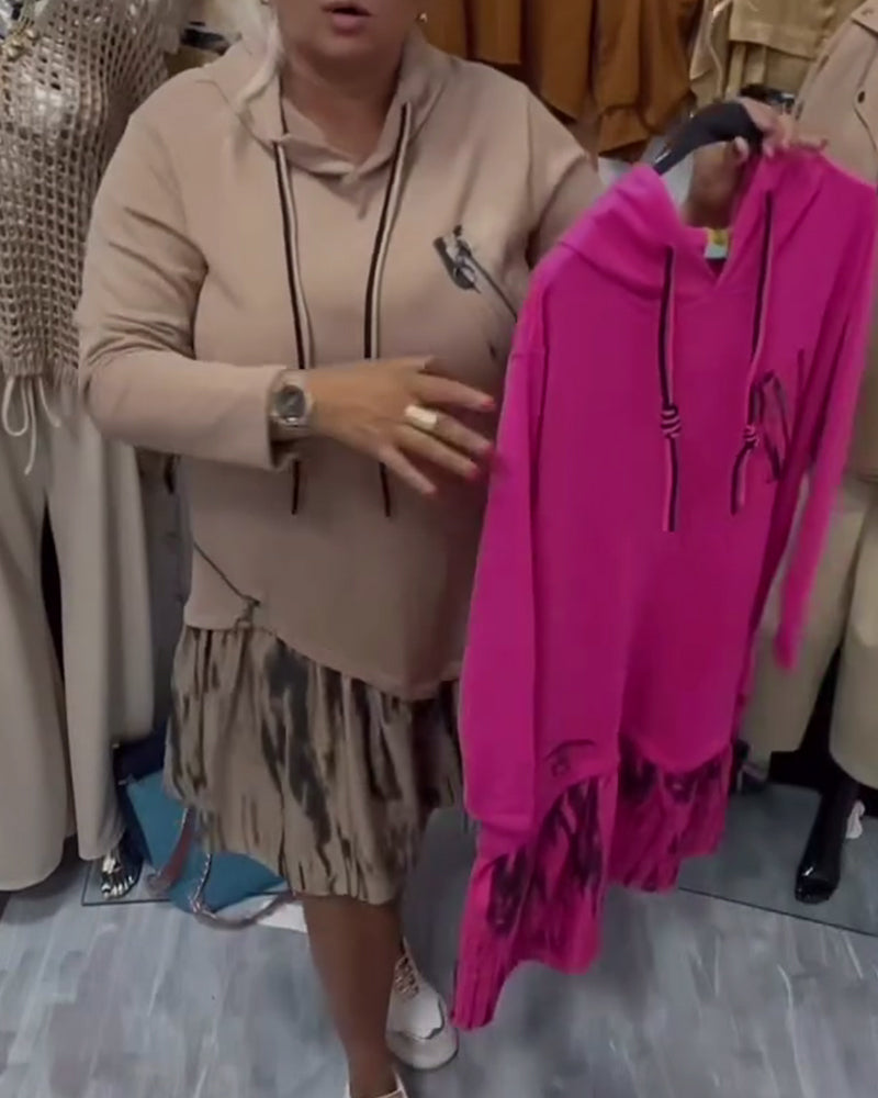 Kjole Med Hette Denim Lappet Arbeid Fallende Skulder
