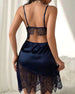 Omfavn tidløs eleganse med et dristig twist i denne fantastiske lange nattkjolen. Den smigrende halter-halsen flyter over i delikat knipling og gjennomsiktig mesh, og skaper en fortryllende gjennomsiktig effekt. En sensuell høy splitt legger til en streif av fristelse, mens den flytende silhuetten faller yndefullt over kurvene dine for et uforgl...