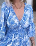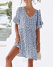 V-halset kjole med blomstermønster med volanger