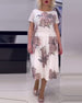 SPESIFIKASJONER Stil: Elegant Materiale: Chiffon,Polyester Kjole type: A-line Kjolens lengde: Midi Halslinje: V-hals Mønstertype: Trykt Ermetype: Vanlig erme Erme lengde: Kort erme Detaljer: Lappeverk, Snøre opp Passform type: Vanlig Årstid: Vår, Sommer, Høst Anledning: Daglig Pakken inkluderer: 1 x Kjole STØRRELSESTABELL (cm) ...