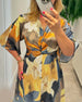 Elegant kjole med trykk med V-hals-fold og klokkeerm