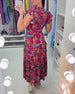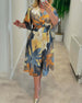 Elegant kjole med V-hals i fargerik blomstertrykk