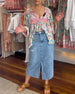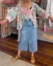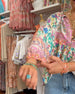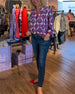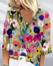 En fargerik fritidsbluse med blomstertrykk med V-hals og trekvart erme