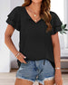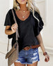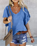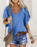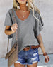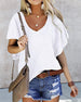 SPESIFIKASJONER Topp type: T skjorte Stil: Uformelt Materiale: Bomullsblandinger Anledning: Daglig Halslinje: V-hals Mønstertype: Ensfarget Ermetype: Volanger erme Erme lengde: Kort erme Passform type: Løs Årstid: Vår, Sommer, Høst Pakken inkluderer: 1 x T-skjorte STØRRELSESTABELL (cm) Størrelse Bryst Lengde Arm S 100 68 24 M ...