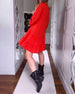 Ensfarget V-hals kjole med utsvingt lange ermer og patchwork