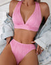 SPESIFIKASJONER Stil: Ferie Materiale: 15% Spandex,85% Polyester Anledning: Ferie Halslinje: Halter Mønstertype: Trykt Erme lengde: Ermeløs Topp type: Bikini BH type: Push up Truse type: Høyt snitt Passform type: Skinny Detaljer: Ryggløs Pakken inkluderer: 1 x Bikini STØRRELSESTABELL (cm) Størrelse Bryst Midje Hofte Under byste S 88 73 96 ...