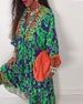 Ensfarget V-hals kjole med utsvingt lange ermer og patchwork