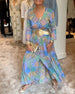 Elegant kjole med trykk med V-hals-fold og klokkeerm