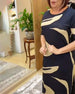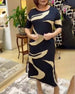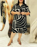 Ermeløs, elegant kjole med geometrisk trykk med rund hals