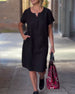 SPESIFIKASJONER Stil: Uformelt Materiale: Bomullsblandinger Kjole type: Rett Kjole Kjolens lengde: Knelengde Halslinje: V-hals Mønstertype: Ensfarget Ermetype: Vanlig erme Erme lengde: Kort erme Detaljer: Lomme Passform type: Vanlig Årstid: Sommer Anledning: Daglig Pakken inkluderer: 1 x Kjole STØRRELSESTABELL (cm) Størrelse Bryst Lengde S...