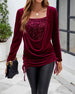 SPESIFIKASJONER Topp type: Topper Stil: Uformelt Materiale: Fløyel Anledning: Daglig Halslinje: Firkantet hals Mønstertype: Ensfarget Ermetype: Vanlig erme Erme lengde: Langermet Passform type: Vanlig Årstid: Høst,Vinter Detaljer: Lappeverk,Rynket,Snøring Pakken inkluderer: 1 x Topp STØRRELSESTABELL (cm) Størrelse Bryst Lengde S 97 65 M ...