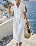 SPESIFIKASJONER Stil: Uformelt Materiale: 20% Lin, 80% Bomull Kjole type: A-line Kjolens lengde: Midi Halslinje: Båndkrage Mønstertype: Ensfarget Ermetype: Vanlig erme Erme lengde: Kort erme Detaljer: Lomme Passform type: Vanlig Årstid: Vår,Sommer Anledning: Daglig Pakken inkluderer: 1 x Kjole STØRRELSESTABELL (cm) Størrelse Bryst Lengd...