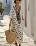 SPESIFIKASJONER Stil: Boho Materiale: Bomullsblandinger Kjole type: Rett Kjole Kjolens lengde: Maxi Halslinje: V-hals Mønstertype: Blader,Trykt Ermetype: Flaggermus erme Erme lengde: 3/4 erme Detaljer: Snøre opp Passform type: Løs Årstid: Vår,Sommer,Høst,Vinter Anledning: Daglig Pakken inkluderer: 1 x Kjole STØRRELSESTABELL (cm) Størrelse Br...