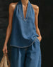 SPESIFIKASJONER Stil: Elegant Topp type: Tank Topp Kategori: Sett Materiale: Denim Mønstertype: Ensfarget Halslinje: Halter Bukse type: Bredt ben Bukselengde: Lang Midje type: Midt i midjen Passform type: Vanlig Årstid: Vår,Sommer Detaljer: Lomme Anledning: Daglig Pakken inkluderer: 1 x Tank-topp, 1 x Bukser STØRRELSESTABELL (cm) Størrelse B...