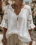 SPESIFIKASJONER Topp type: Bluser Stil: Uformelt Materiale: Bomullsblandinger Anledning: Daglig Halslinje: V-hals Ermetype: Volanger erme Erme lengde: 3/4 erme Passform type: Vanlig Årstid: Vår,Sommer Detaljer: Lappeverk,Blonder Pakken inkluderer: 1 x Bluse STØRRELSESTABELL (cm) Størrelse Bryst Lengde S 97 65 M 101 66.5 L 105 68 XL 1...