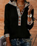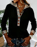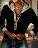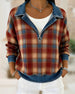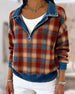 Kvinne Kausal Genser Med Krage Design, Denim Stoff, Patchworkdetalj, Rutenmønster Trykk Och Pullover Stil