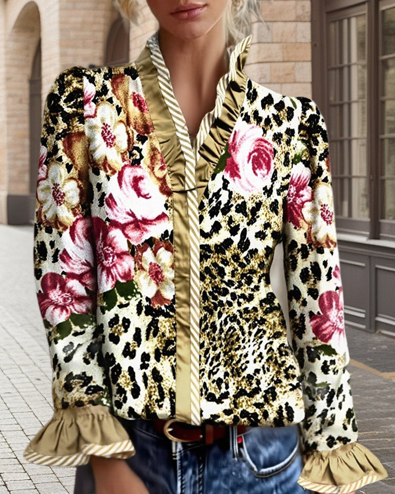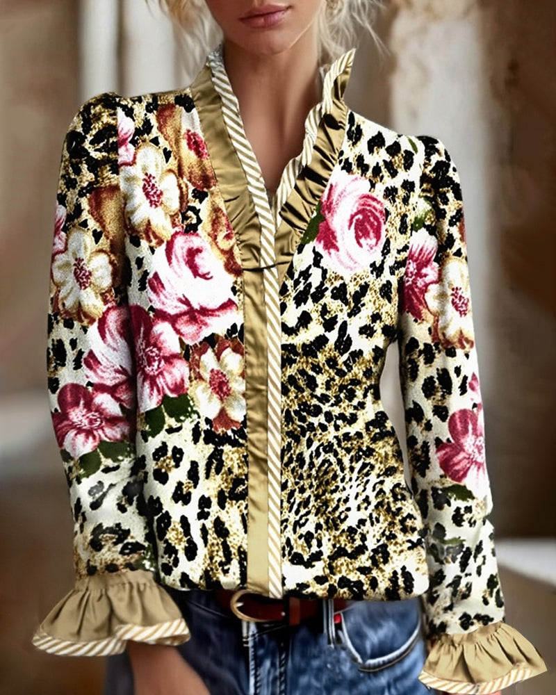 T-Shirt Med Personlig Stil, V-Hals, Leopardmønster Och Patchworkdesign