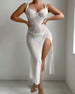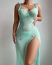 SPESIFIKASJONER Stil: Sexy Materiale: Bomullsblandinger Kjole type: Bodycon Kjolens lengde: Maxi Halslinje: V-hals Mønstertype: Ensfarget Erme lengde: Ermeløs Detaljer: Høy åpning,Bue-knute Passform type: Skinny Årstid: Vår,Sommer Anledning: Daglig Pakken inkluderer: 1 x Truser,1 x Kjole STØRRELSESTABELL (cm) Størrelse Bryst Lengde S ...