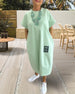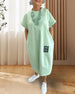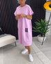 SPESIFIKASJONER Stil: Uformelt Materiale: Bomullsblandinger Kjole type: Rett Kjole Kjolens lengde: Midi Halslinje: Rund hals Mønstertype: Brev Ermetype: Vanlig erme Erme lengde: Kort erme Detaljer: Lomme Passform type: Vanlig Årstid: Vår,Sommer Anledning: Daglig Pakken inkluderer: 1 x Kjole STØRRELSESTABELL (cm) Størrelse Bryst Lengde S 97...
