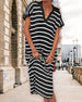 SPESIFIKASJONER Stil: Uformelt Materiale: Bomull,Polyester Kjole type: Rett Kjole Kjolens lengde: Midi Halslinje: Slag Mønstertype: Stripete Ermetype: Vanlig erme Erme lengde: Kort erme Detaljer: Spalte Passform type: Vanlig Årstid: Vår,Sommer Anledning: Daglig Pakken inkluderer: 1 x Kjole STØRRELSESTABELL (cm) Størrelse Skulder Bryst ...
