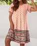 SPESIFIKASJONER Stil: Uformelt Materiale: Bomullsblandinger Kjole type: Rett Kjole Kjolens lengde: Knelengde Halslinje: Rund hals Mønstertype: Trykt Ermetype: Vanlig erme Erme lengde: Kort erme Detaljer: Rynket Passform type: Vanlig Årstid: Vår,Sommer Anledning: Daglig Pakken inkluderer: 1 x Kjole STØRRELSESTABELL (cm) Størrelse Bryst Lengde...