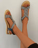 SPESIFIKASJONER Stil: Uformelt Tå type: Åpen tå Sko type: Sko med kileform Hæltype: Kilehæl Øvre materialer: Pu Yttersåle materialer: Gummi Fôrmaterialer: Pu Hælhøyde type: 5 cm Mønstertype: Fargeblokk Årstid: Vår,Sommer Detaljer: Lappeverk Anledning: Daglig Pakken inkluderer: 1 x Sandal STØRRELSESTABELL (cm) Størrelse Lengde 35 22.5 ...