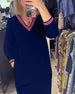 SPESIFIKASJONER Stil: Uformelt Materiale: 5% Spandex, 95% Polyester Kjole type: Rett Kjole Kjolens lengde: Knelengde Halslinje: V-hals Mønstertype: Stripete Ermetype: Vanlig erme Erme lengde: 3/4 erme Detaljer: Lomme Passform type: Vanlig Årstid: Høst,Vinter Anledning: Daglig Pakken inkluderer: 1 x Kjole STØRRELSESTABELL (cm) St...