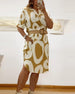 SPESIFIKASJONER Stil: Uformelt Materiale: Bomullsblandinger Kjole type: A-line Kjolens lengde: Midi Halslinje: V-hals Mønstertype: Trykt Ermetype: Vanlig erme Erme lengde: 3/4 erme Passform type: Vanlig Årstid: Vår, Sommer Anledning: Daglig Pakken inkluderer: 1 x Kjole STØRRELSESTABELL (cm) Størrelse Bryst Lengde S 95 120 M 100 121.5 L...