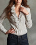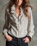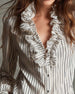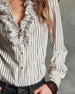 SPESIFIKASJONER Topp type: Bluser Stil: Uformelt Materiale: Bomullsblandinger Anledning: Daglig Halslinje: V-hals Mønstertype: Stripete Ermetype: Lanterne erme Erme lengde: Langermet Passform type: Vanlig Årstid: Vår,Sommer Detaljer: Knapper,Rufsete Pakken inkluderer: 1 x Bluse STØRRELSESTABELL (cm) Størrelse Bryst Lengde S 97 65 M 101 6...
