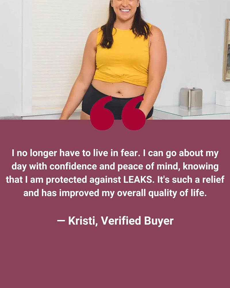 "Jeg følte at jeg alltid levde i konstant ubehag på grunn av lekkasjene mine. Jeg måtte hele tiden justere meg og bekymre meg for flekker. Det var en endeløs syklus av stress og angst. Etter at jeg fant dette lekkasjesikre undertøyet, kan jeg nå nyte mine daglige aktiviteter i komfort og med selvtillit. Jeg trenger ikke lenger bekymre meg hele tiden – og det har virkelig forandret livet mitt." – Lauren R.