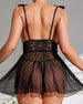 SPESIFIKASJONER Stil: Sexy Materiale: Mesh Kjole type: A-line Kjolens lengde: Over kneet Halslinje: V-hals Mønstertype: Prikk Erme lengde: Ermeløs Detaljer: Blonder Passform type: Vanlig Årstid: Vår,Sommer,Høst,Vinter Pakken inkluderer: 1 x Truser,1 x Kjole STØRRELSESTABELL (cm) Størrelse Under bysten Midje Lengde S 64 64 70 M 68 68 7...
