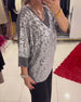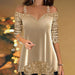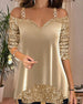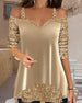 SPESIFIKASJONER Topp type: Topper Stil: Uformelt Materiale: Bomullsblandinger,Paljetter Anledning: Daglig Halslinje: V-hals Mønstertype: Paljett,Ensfarget Ermetype: Vanlig erme Erme lengde: 3/4 erme Passform type: Vanlig Årstid: Vår,Høst,Vinter Detaljer: Lappeverk Pakken inkluderer: 1 x Topp STØRRELSESTABELL (cm) Størrelse Bryst Lengde S 9...