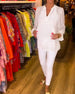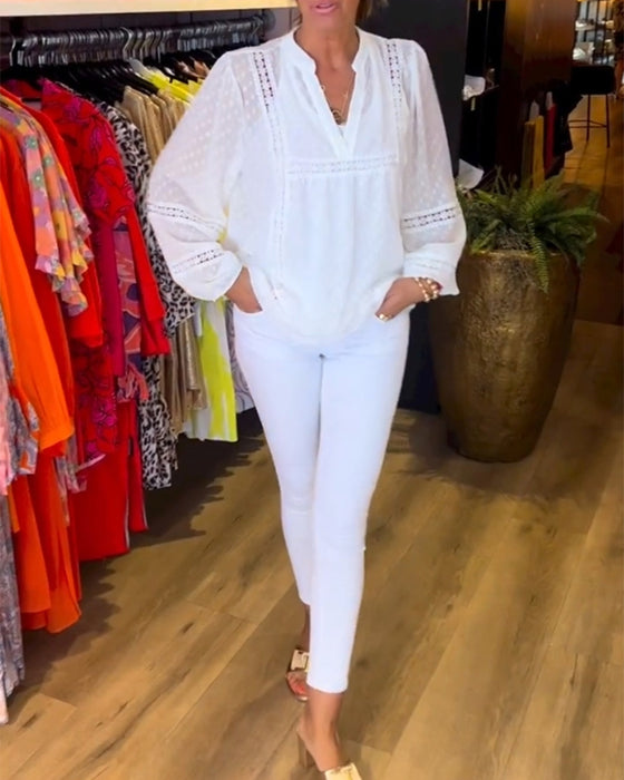 Uformell bluse med v-hals i ensfarget med knapp
