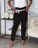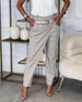 Fasjonable ensfargede bukser med lomme og uregelmessig patchwork
